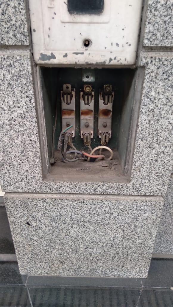 • Tablero portero eléctrico con cables expuestos en la vía pública. Se observa ...