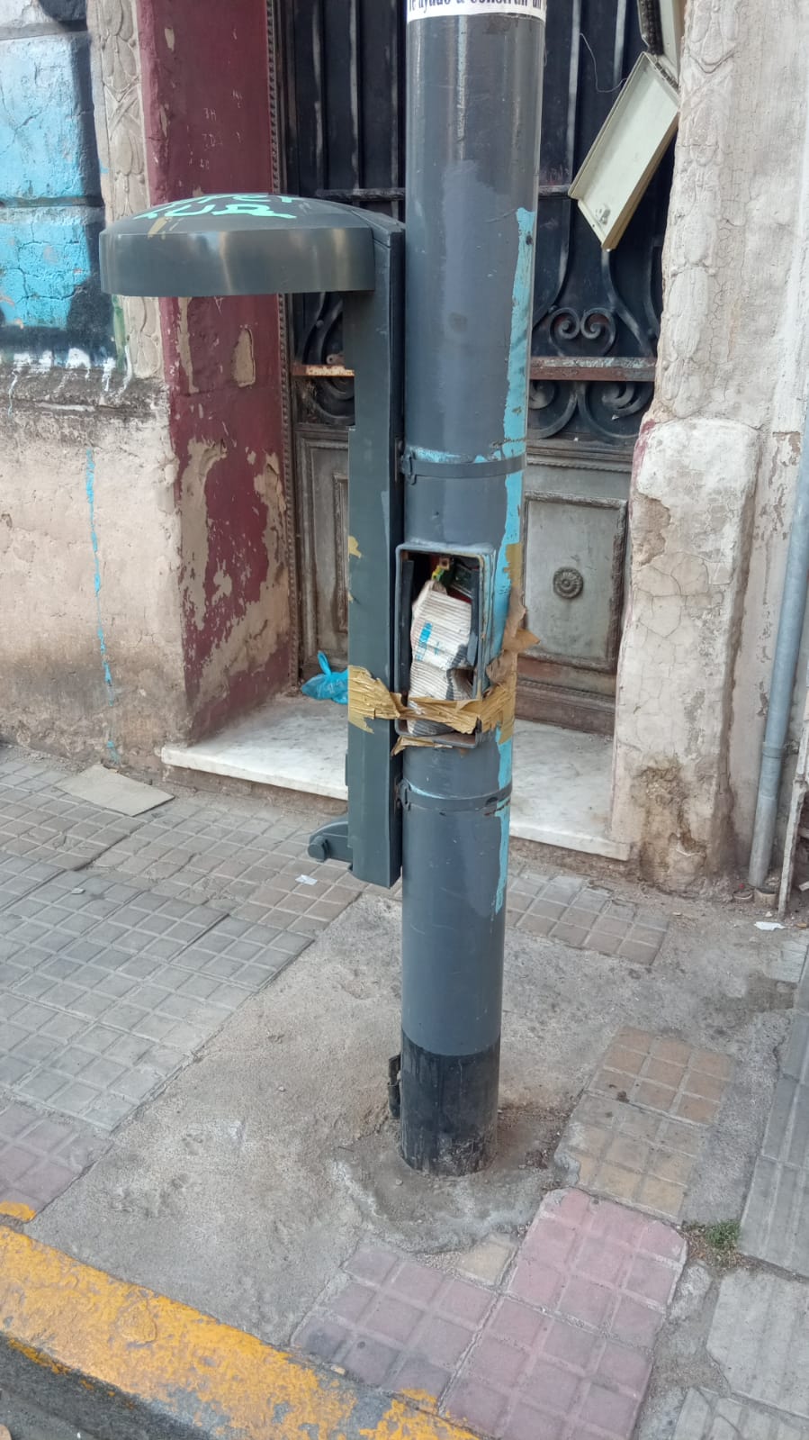 • Tablero de comando de semáforos en muy mal estado en esquina en vereda de escue...